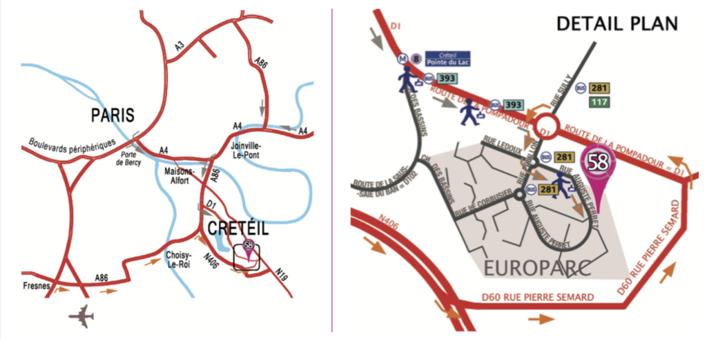 Accès à pieds depuis Métro ligne 8 (Créteil Pointe du Lac) et Bus 117, 281 ou 393.